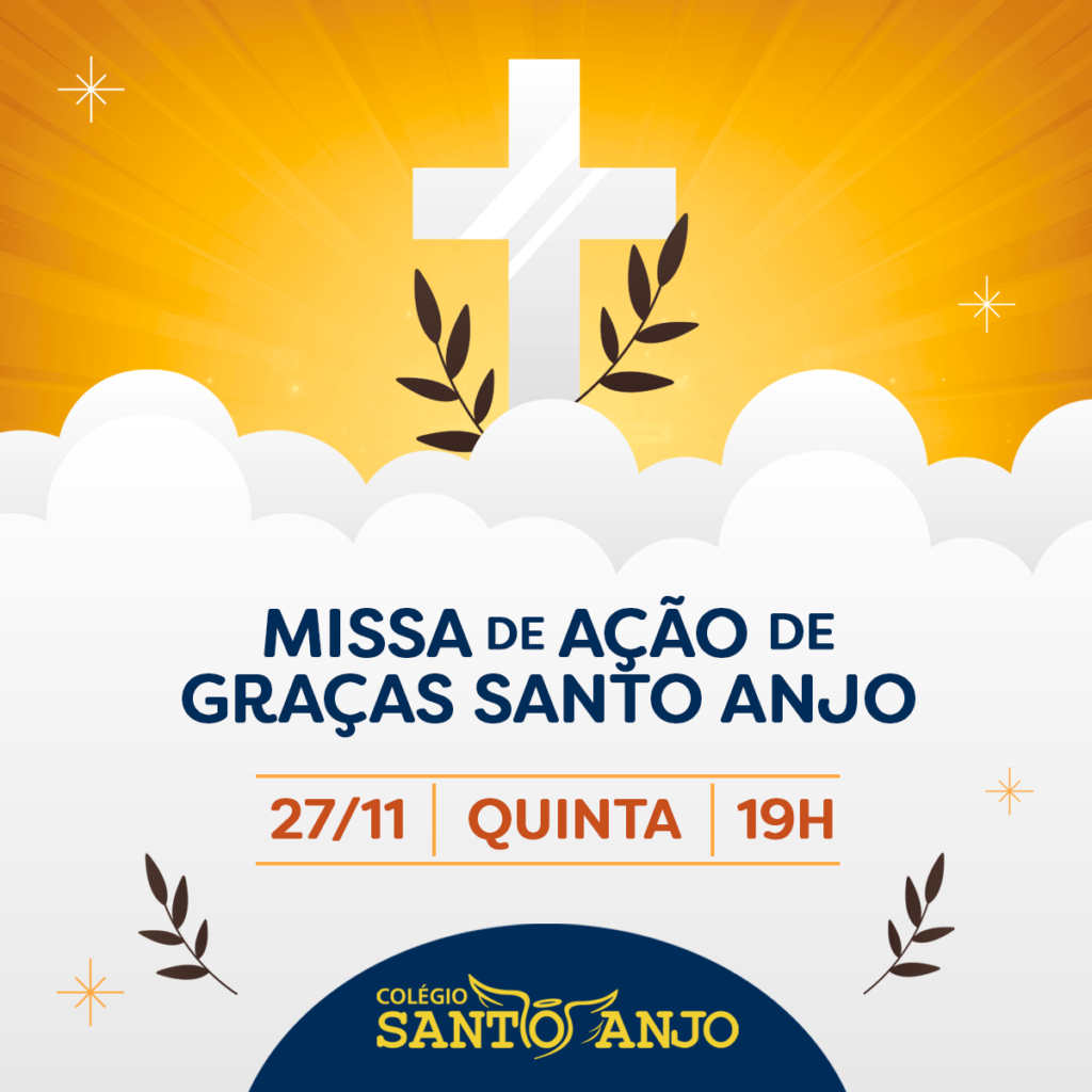 A Pastoral Santo Anjo convida todos os alunos, familiares e colaboradores, para a Missa em Ação de Graças que acontecerá na quinta-feira, dia 27 de novembro, às 19h, na Paróquia São João Batista Precursor – Rua Domingos Imbronizio, n.º 100 (perto da unidade Barigui)